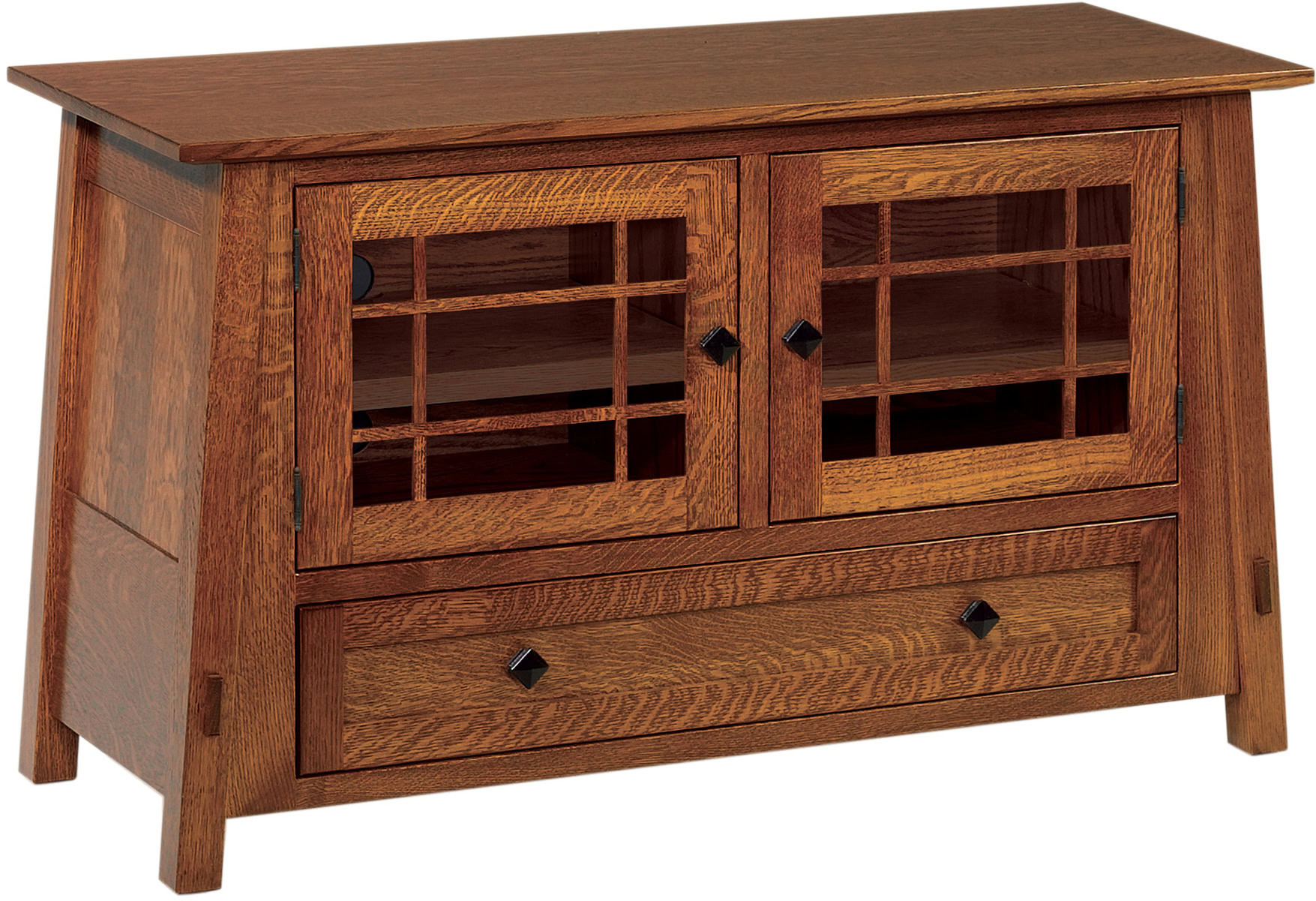 The McCoy TV Cabinets with Drawers has a classic Mission styling that brings elegant design to your entertainment space. Not only are these cabinets beautiful, they also offer plenty of storage space. Soft-close doors and drawers conceal your media accessories and devices, so you can keep your space tidy and uncluttered. The mullioned glass doors feature lightly smoked glass, so your remote controls will still be able to communicate with your devices. Adjustable shelving also offers versatile storage options within the cabinet itself. Finally, exposed tenons and black diamond hardware put the touches on these cabinets that set them apart.