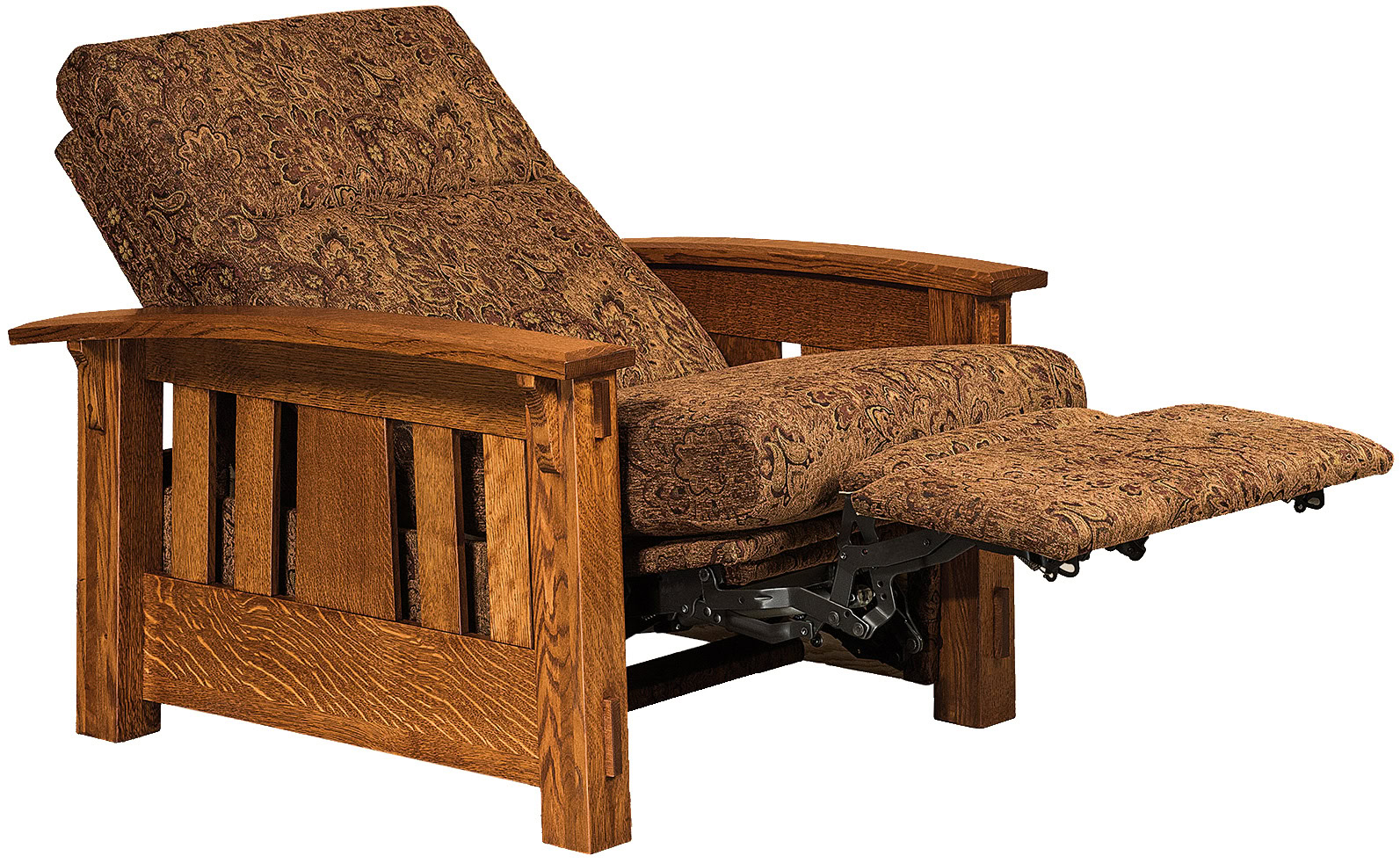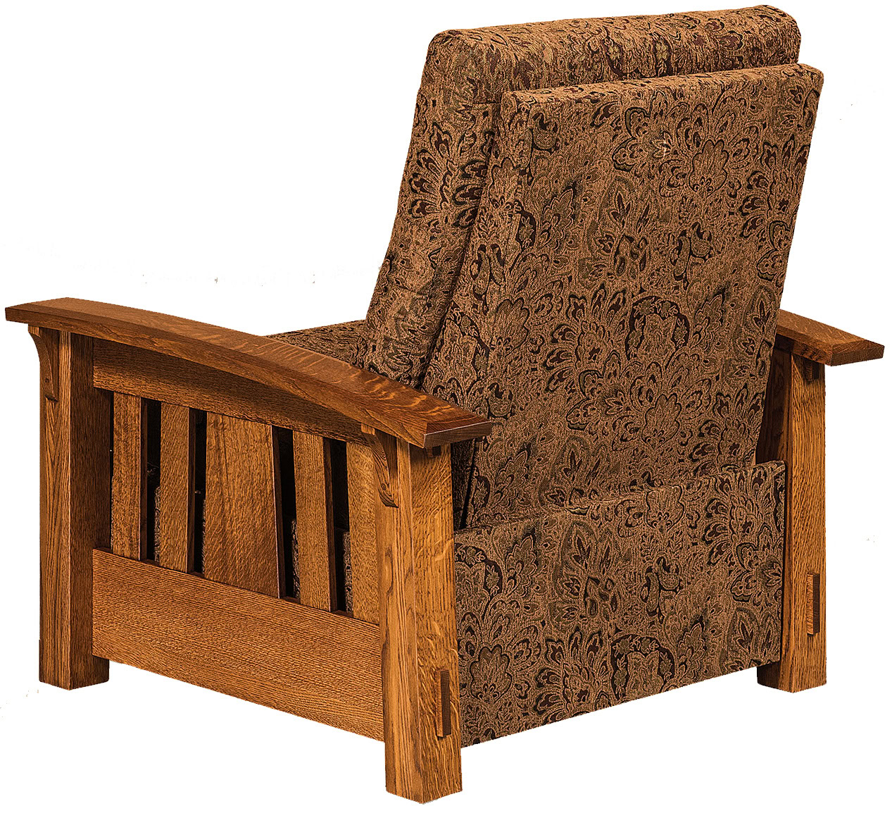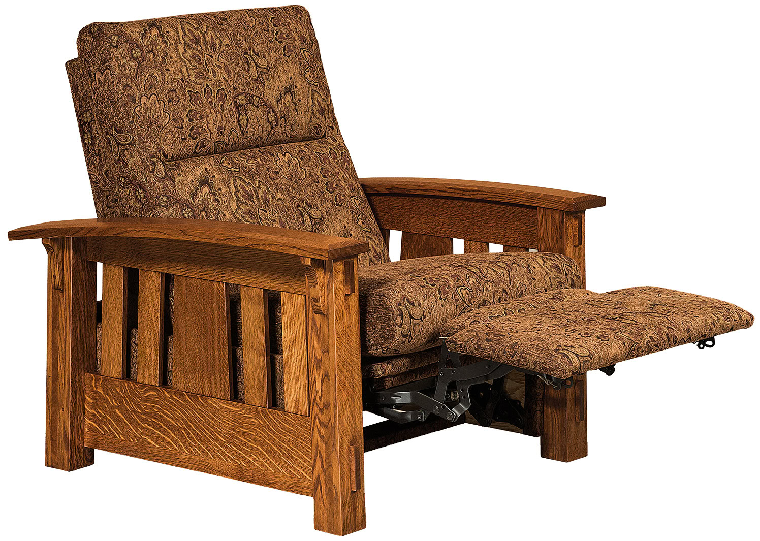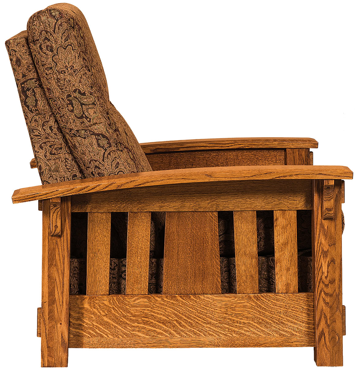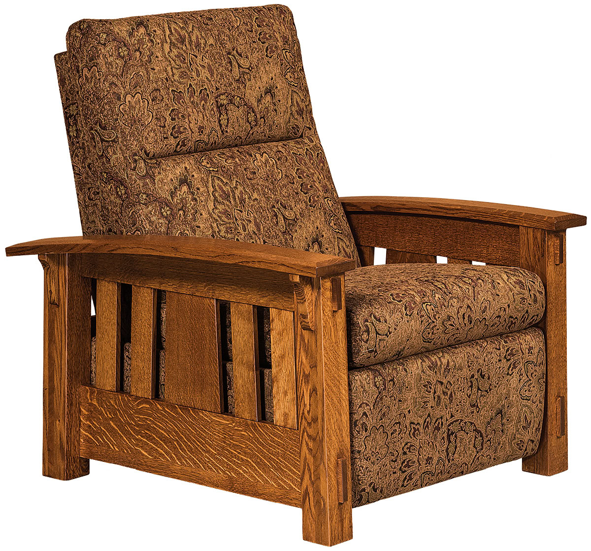 The bow arms with beveled edges, decorative corbels as well as the slat design attest to the superior construction. So it is no surprise that the best cabinetmakers in the Midwest handcraft each recliner. These craftsmen are Amish. Also, they build the frame from quality regional hardwoods. Such as cherry, maple, and quarter-sawn oak (shown). So the recliner is sturdy, durable – and heirloom-quality!