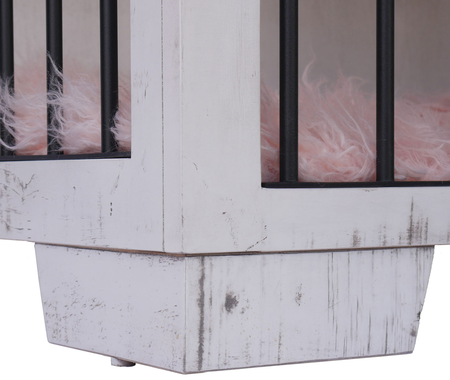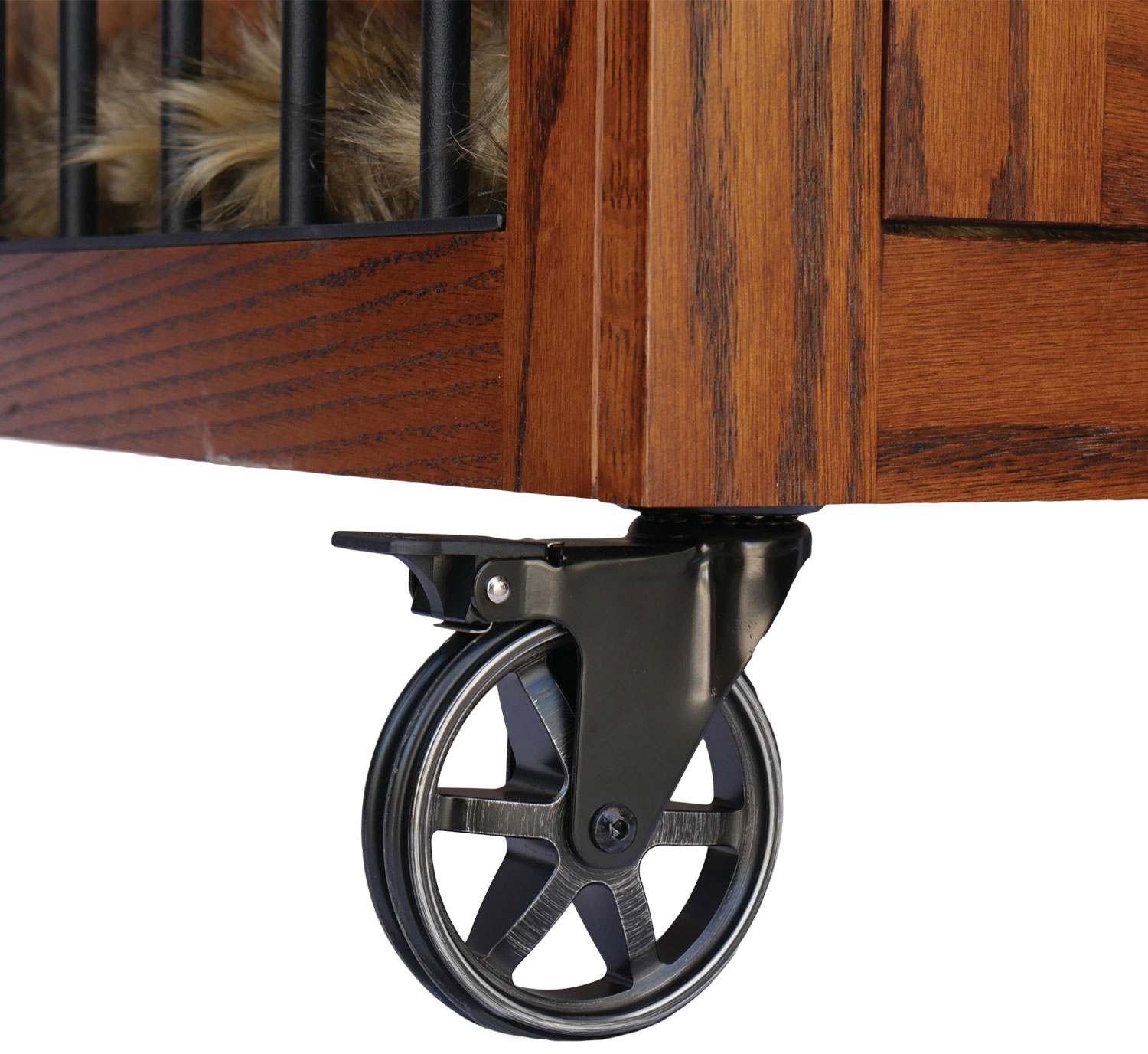 Now you can keep your dog in its own place — close to hand and in style! That’s the idea behind the Medium Dog Retreat. At 43 inches high, the crate is big enough for your large dog. Also, you can choose hinge doors or barn-style sliding doors. What’s more, we offer the crate with your choice of black, silver or bronze bars. And you can choose from two styles of fixed bases. Or, you may go for a caster base, which makes it easy to move the crate around. Amish cabinetmakers — the best in the Midwest — build the crate from top hardwoods like oak and brown maple (shown). So, the crate is heirloom-quality. Ready to order? Click the “Customize this product” button below. Then, fill out the customization fields. Or call 877-357-2106.