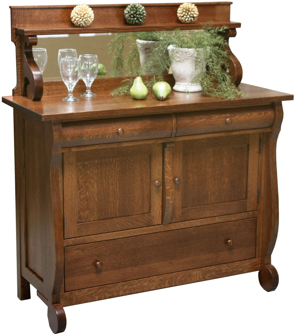 The Millie’s Buffet delights the eye with its curved profile, rounded drawer fronts, round knob hardware and beveled mirror backsplash. Indeed, the 4-inch-wide shelf above the mirror is ideal for placing decorative items. The drawers open the whole way out for easy access. And they soft-close with a gentle push. An adjustable shelf behind the doors helps make the most of the storage space. While concealed European hinges enhance the elegance of the piece. Amish cabinetmakers — the best in the Midwest — build the buffet from top hardwoods like oak, maple and cherry. No wonder the piece is so sturdy, it’s heirloom-quality! Ready to order? Click the “Customize this product” button below. Then, fill out the open (blank) fields. Or call 877-357-2106 today.