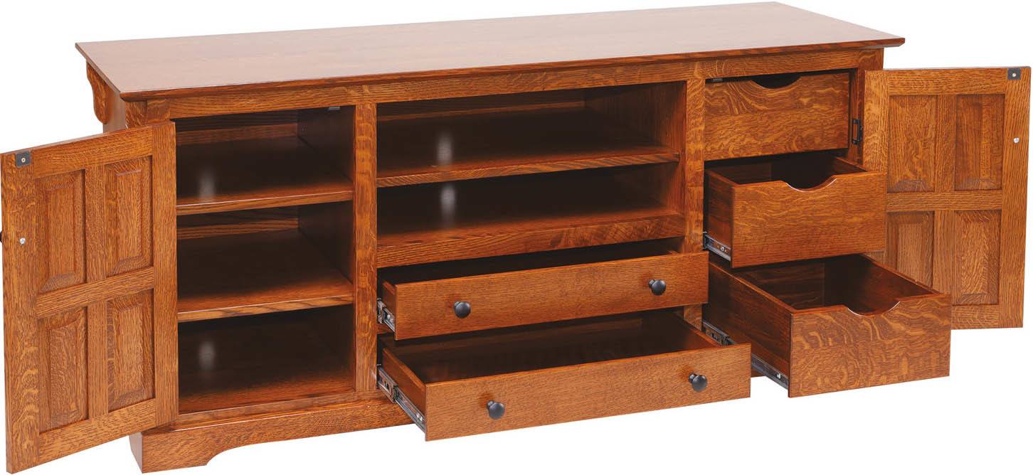 A sturdy design and beautiful craftsmanship meet in the Mission Hills TV Console. This stand offers ample storage and open display areas for your electronics. Behind the left door, you’ll find adjustable shelving. While the right door opens to reveal three full-extension drawers, so you have an abundance of dynamic storage options. Of course, details like corbels and paneling are the real show-stoppers on this TV stand. This is a truly stunning piece that is sure to complement any decor.