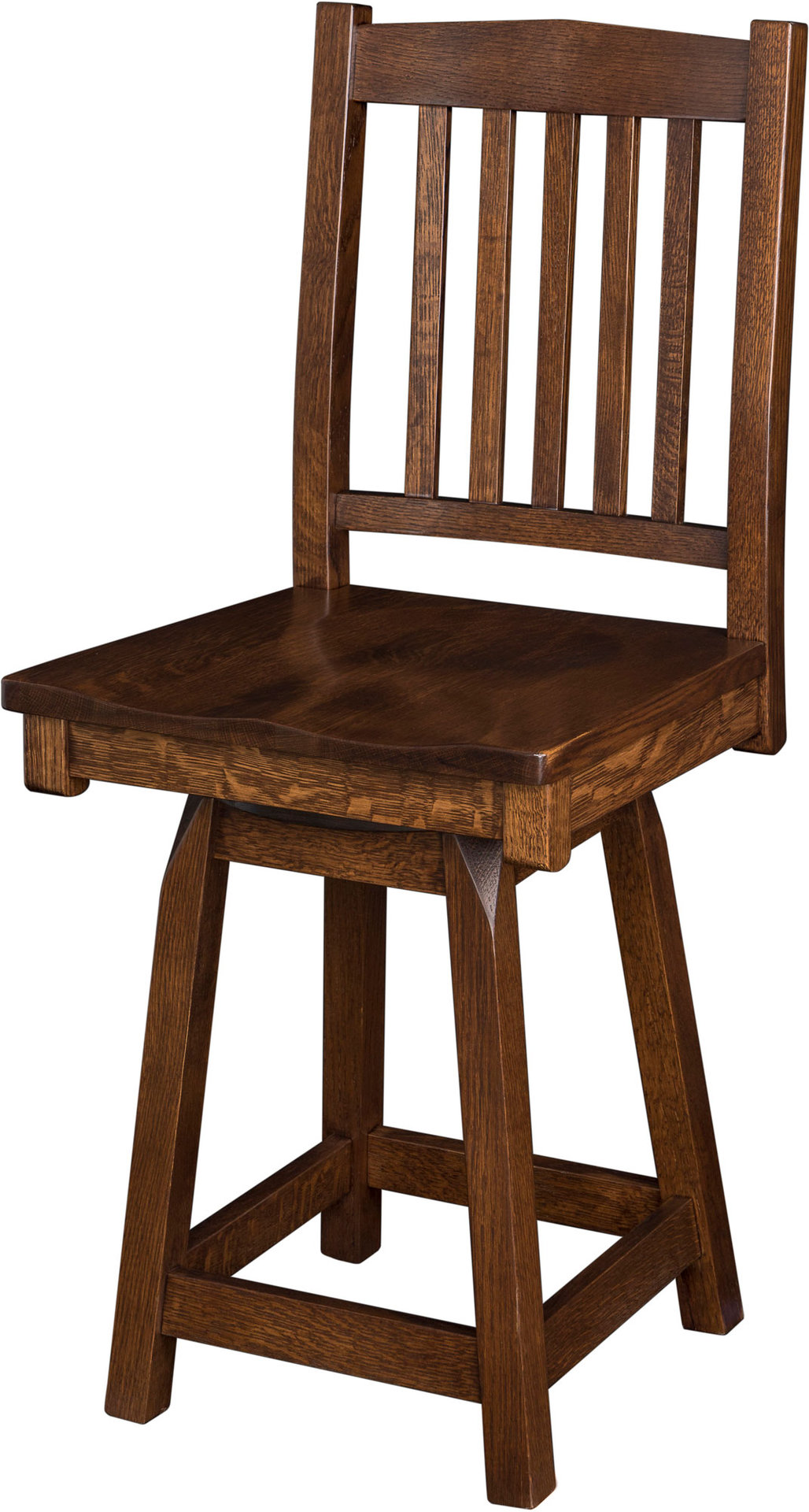 The clean lines, slats and robust look of the Mission design are clearly displayed in the Mission Style Barstool. Imagine how much this piece will enhance the convenience and look of your kitchen counter, island kitchen or in-home bar! The saddle scoop seat with Mission edge enhances comfort. We offer the piece as a stationary and swivel barstool. Your choice. Amish cabinetmakers, the best in the Midwest, build the barstool. And they use top hardwoods like cherry, maple and quarter-sawn white oak (shown with Michael’s Cherry stain). No wonder the chair is so sturdy and heirloom-quality! Ready to order? Click the “Customize this product” button below. Then, fill out the open (blank) fields. Or call 877-357-2106.