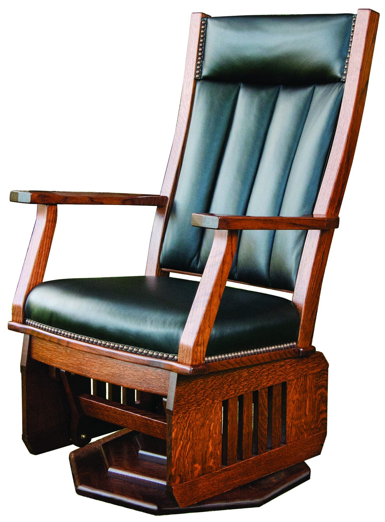 The Mission Swivel Glider has a padded seat and headrest. The glider has a padded back that is plush with comfort. The solid wood arms are designed for optimal support. A nail trim accents the seat and headrest. The glider is featured with the optional swivel base. Also, a glide footstool is available with the chair. Pad the glider out of fabric or leather to fit any decor. Customize the solid wood frame with a variety of wood and stain choices.