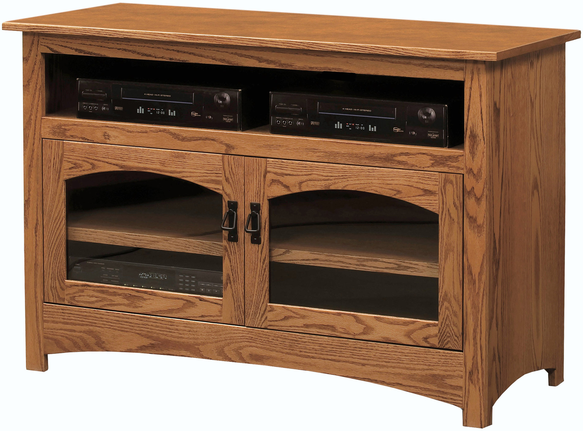 The Mission Two Door TV Cabinet has a simple design and functional storage space. While the arched glass doors offer a classy touch, the structure of this TV stand gives you the perfect home for all your devices. The open space and fixed shelf are sturdy spots for your electronics. You can even add corbels, if you’d like to soften the edges a bit.