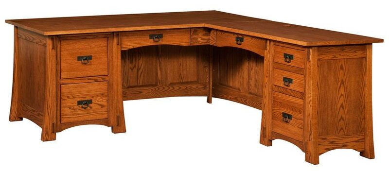 The Modesto Hardwood Corner Desk offers a modern twist on a classic Mission style.  If you are looking to maximize your workspace the corner desk is the perfect solution.  The vast amount of surface space will provide plenty of room for you to multitask between your computer and work papers.  In addition, its rich finish and executive design makes it a classic addition to any office space. It is shown here in Brown Maple with Rich Tobacco Stain but can be customized in your selection of hardwood and stain color to match your office room style and decor.