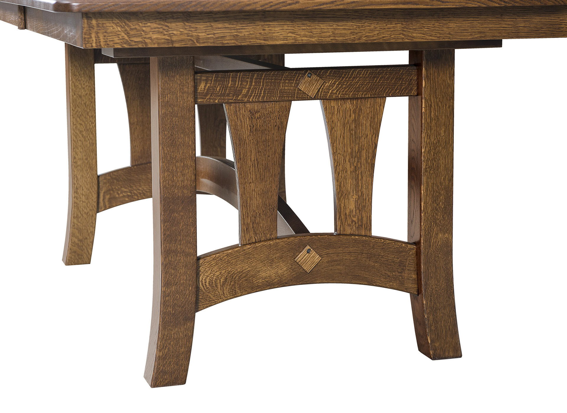 The Naperville Trestle Dining Table features elegant curves and strong tenon highlights in the trestle base. All of our furniture is custom crafted by Amish artisans that only use the finest hardwoods. Our craftsmen create each piece in your selection of hardwood and stain color. This allows it to blend with any dining space you choose. When selecting your table size, keep in mind that you can add up to four leaves. So, you can adjust your dining space easily to accommodate any group.