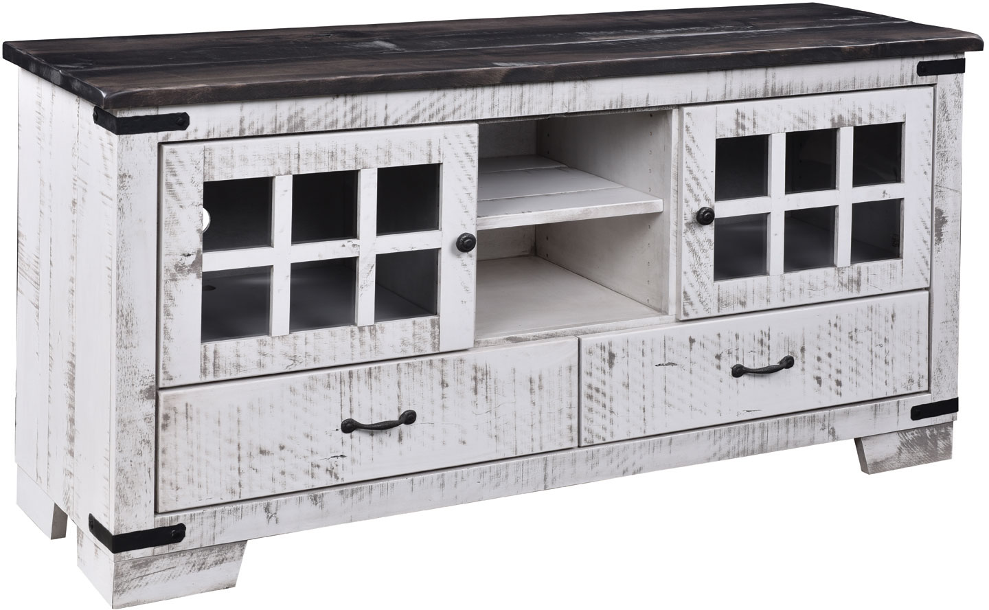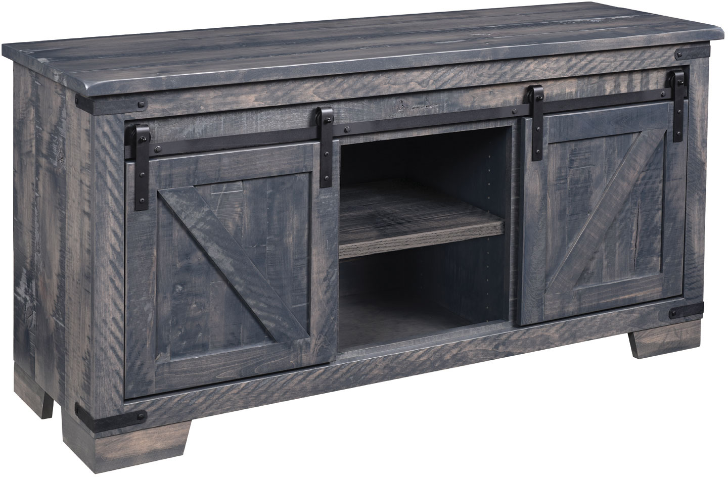 When it comes to a rustic TV cabinet, nothing beats the Old Tymes Style Wide TV Stand — in looks, durability or customizable features. Check out the plank-style top, visible saw marks and metal accents on the corners. You can choose between two exciting designs: a unit with two glass doors and two drawers or one with two sliding barn doors. Amish cabinetmakers — the best in the Midwest — build the cabinet from top hardwoods like brown maple. We’re showing one TV stand painted white with Antique Gray Glaze and with an AIM Dark Gray top. The other one features OCS-118 Antique Slate stain. Ready to order this heirloom-quality cabinet? Click the “Customize this product” button below. Then, fill out the customization fields. Or call 877-357-2106.