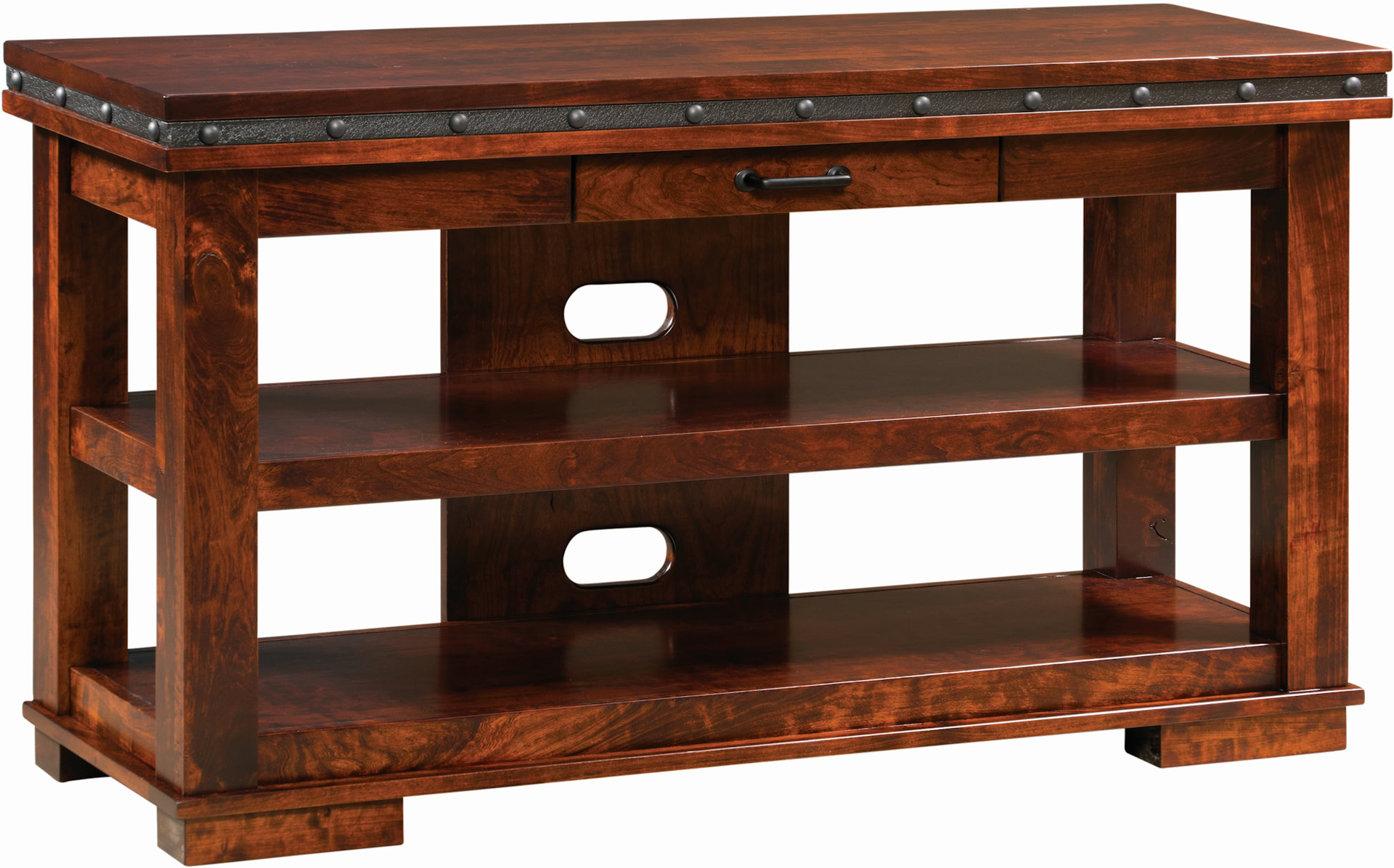 The Pasadena Open TV Console offers spectacular storage space and a unique 1-inch steel band with button details. This TV stand is striking, so it’s sure to help focus attention on your entertaining space. There is a small full-extension drawer which is the perfect spot to keep your remote controls. Now, maybe you won’t lose it every other second. Additionally, you can rest knowing our Amish craftsmen create this console out of only the finest hardwoods. This will ensure your TV console is top notch quality.