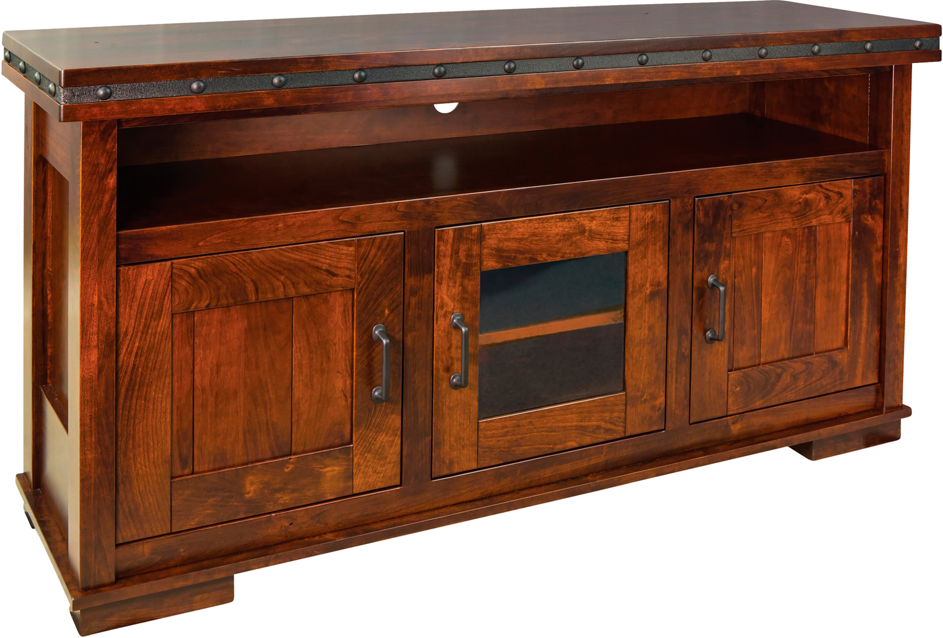 The Pasadena TV Stand has a very sturdy design featuring a unique steel band and button accents. There is open space for all of your TV components as well as three soft-close doors. One glass door so you have even more space for your electronics and two solid wood doors so you can hide unsightly cords, accessories, etc. behind them. Additionally you will find a solid wood adjustable shelf behind each door, too. Clearly this TV stand is both stylish and functional giving you plenty of room for all of your storage needs.