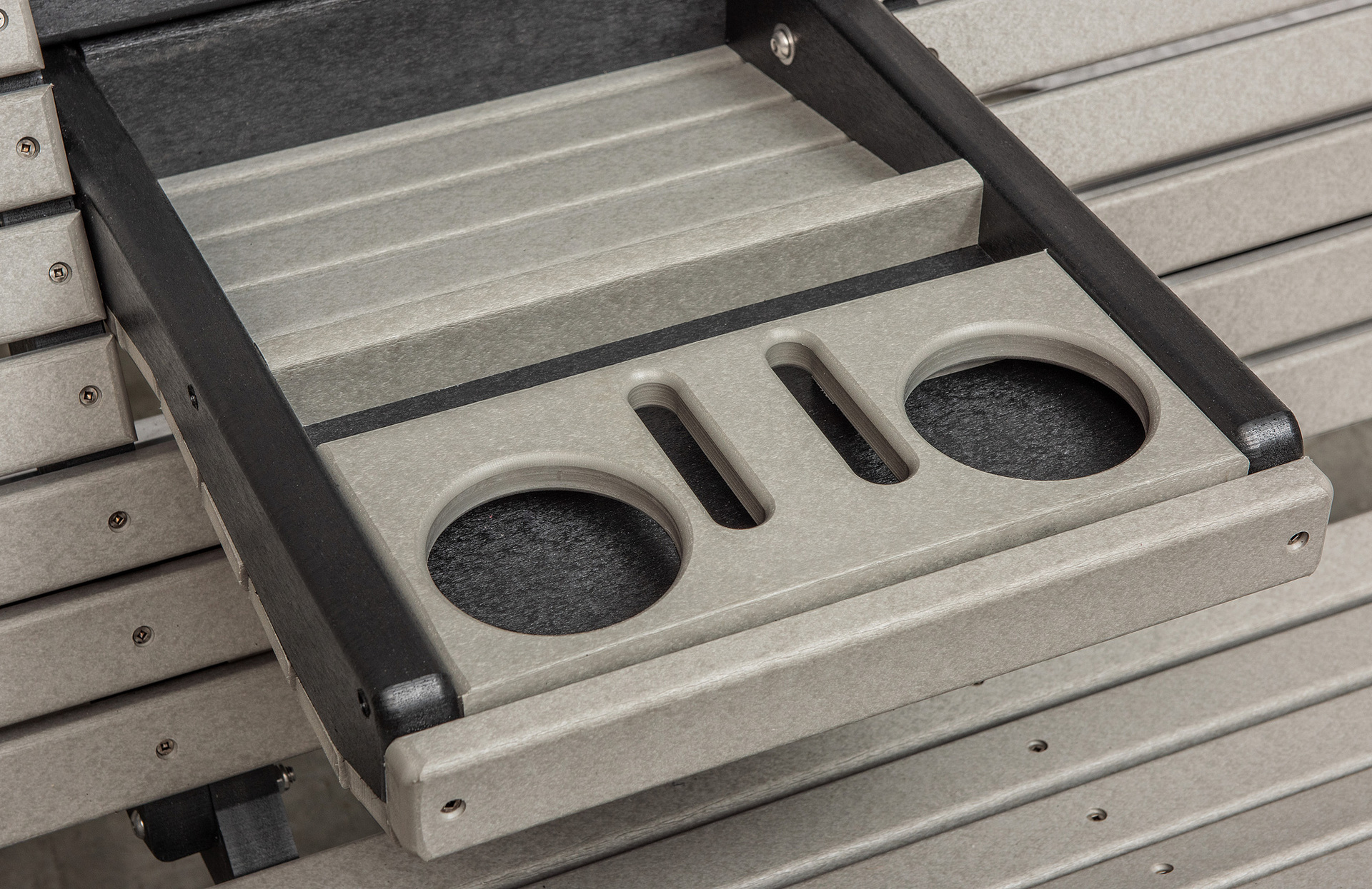 The Poly 5-Foot Deluxe Roll Back Glider delivers comfort and relaxation in more ways than one. It’s wide enough to seat three. Or, pull down the fold-out cup holder. And you and a companion can enjoy the comfortable, contoured seat. Plus the smooth gliding action. As well as easy access to a beverage and your cell phone. Amish artisans build the glider. And they use maintenance-free poly material. Plus powder-coated aluminum. So, the glider resists fading, cracking and splintering. Despite being subject to the elements. The glider is mold-resistant and eco-friendly. What’s more, it’s available in 25 exciting colors. And you can order the Poly 5-Foot Deluxe Roll Back Glider as shown. Or, choose any one-color or two-tone combination. (We’re showing it in light gray and black poly.) To order, click the “Customize this product” button below. Then, complete the customization fields. Or call 877-357-2106.