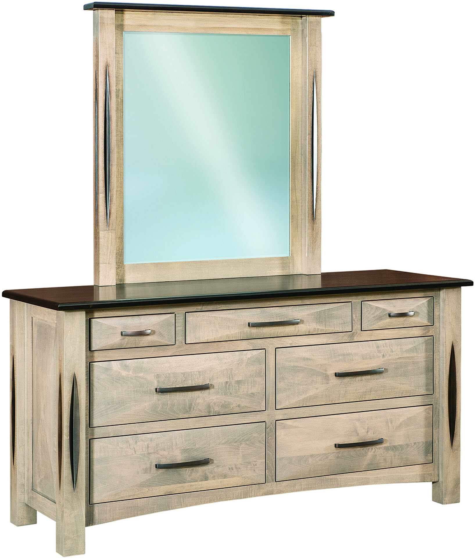 If you’re looking for a dresser that’s a cut above the rest in design, looks, features – and durability – you need to take a second look at the Ravena 7-Drawer Dresser. Because our Amish cabinetmakers create this dresser to surpass expectations. So notice the exclusive raised drawer fronts with its four integrated triangles. Also, the etched grooves in each post enhance the appeal. The drawers open full-extension. So you’ll enjoy easy access to everything inside. Even items at the back. While dovetail drawer joints excel in strength. Plus the top is 1-inch-thick solid hardwood. No wonder the Ravena 7-Drawer Dresser is so beautiful. Sturdy. And heirloom-quality! We’re showing the dresser in brown maple with a Briar Stain top and Driftwood base. To order, click the “Customize this product” button below. Then, complete the customization fields. Or call 877-357-2106.