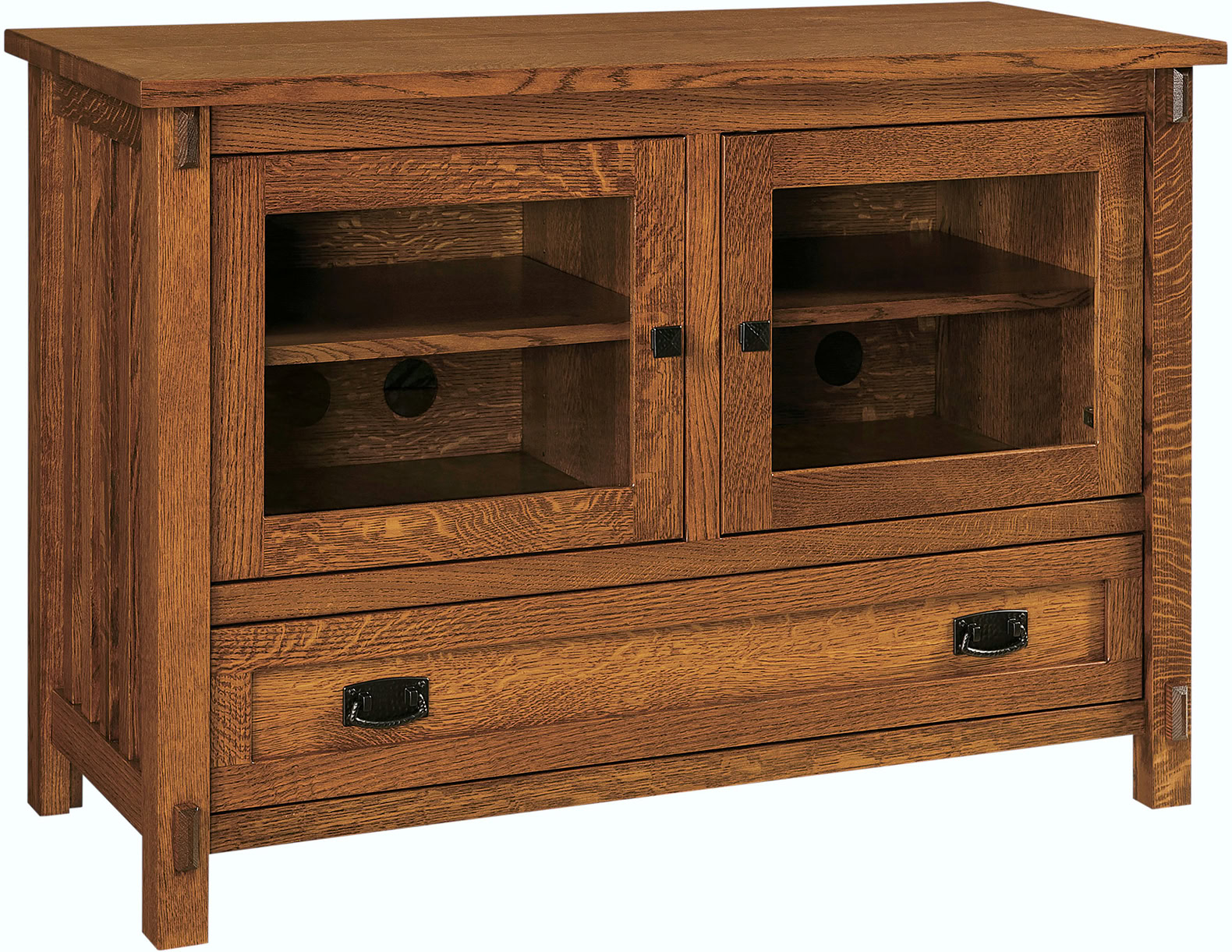 The Rio Mission Small TV Stand has two glass doors and a bottom storage drawer. It has a fairly small footprint so it looks great in smaller spaces. Additionally, if you have more things to store but don’t have room for a bigger model you may be able to simply add more depth with our extra depth model. Then, you will have plenty of storage space in this cute little cabinet.