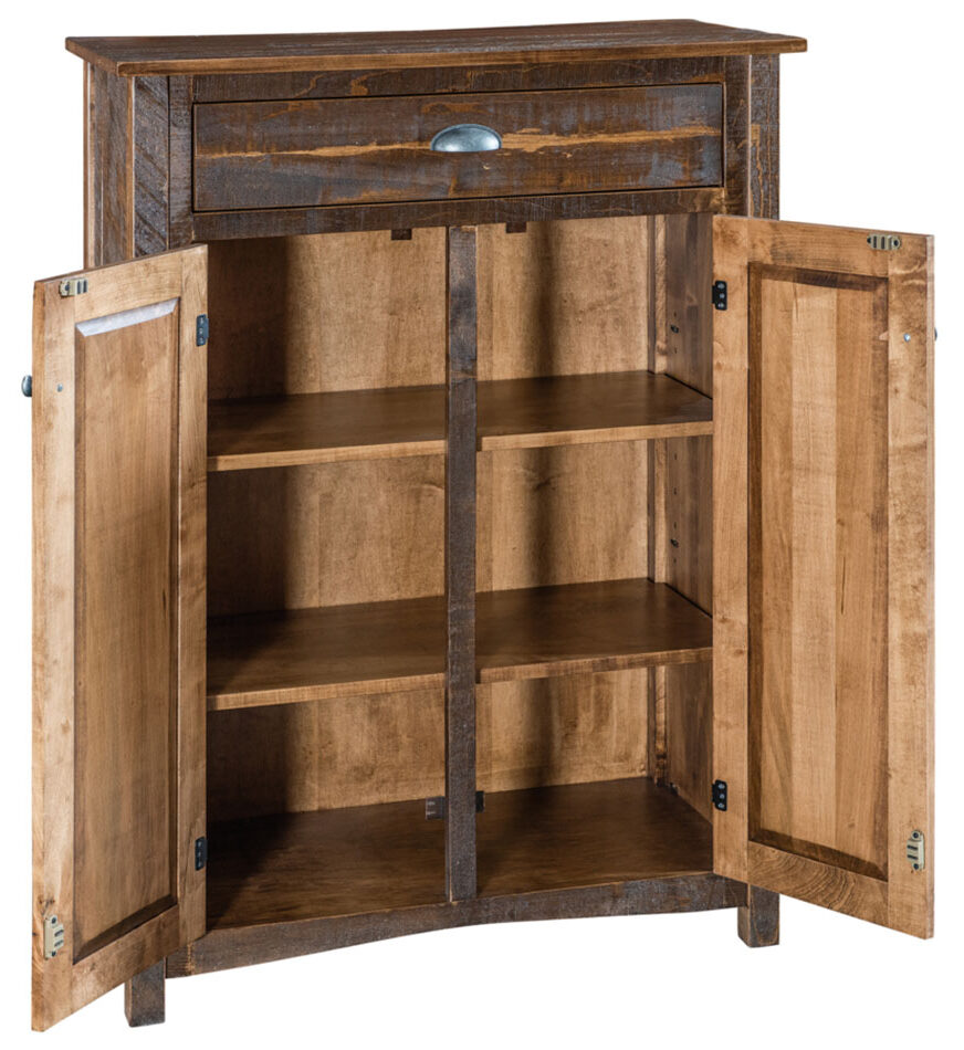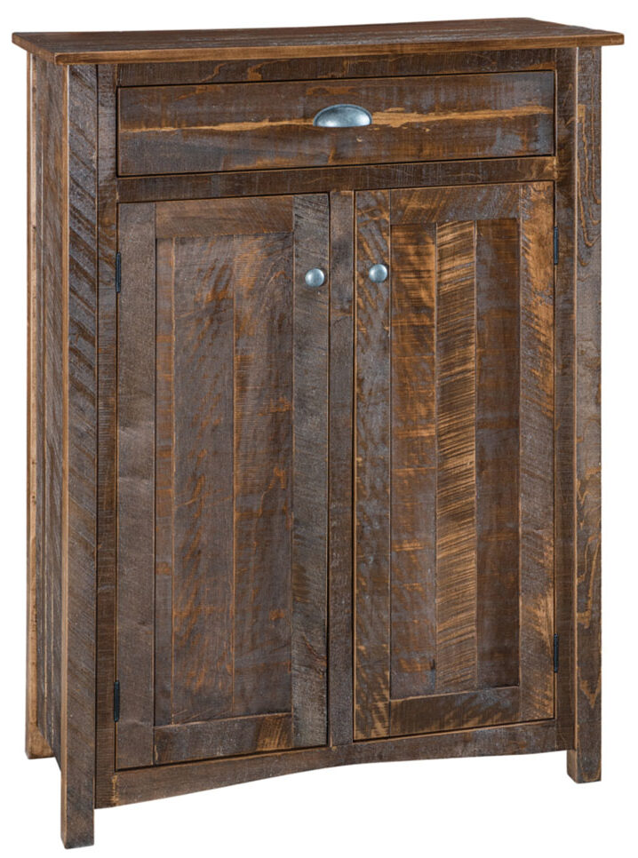 If you like the rustic furniture look, yet appreciate the value of solid hardwood furniture, the Rough Mission Two Door Pie Safe needs to be on your short list. Check out the saw-blade marks and the rustic, Almond finish. Plus, the narrow slats in the reversed raised panel doors.