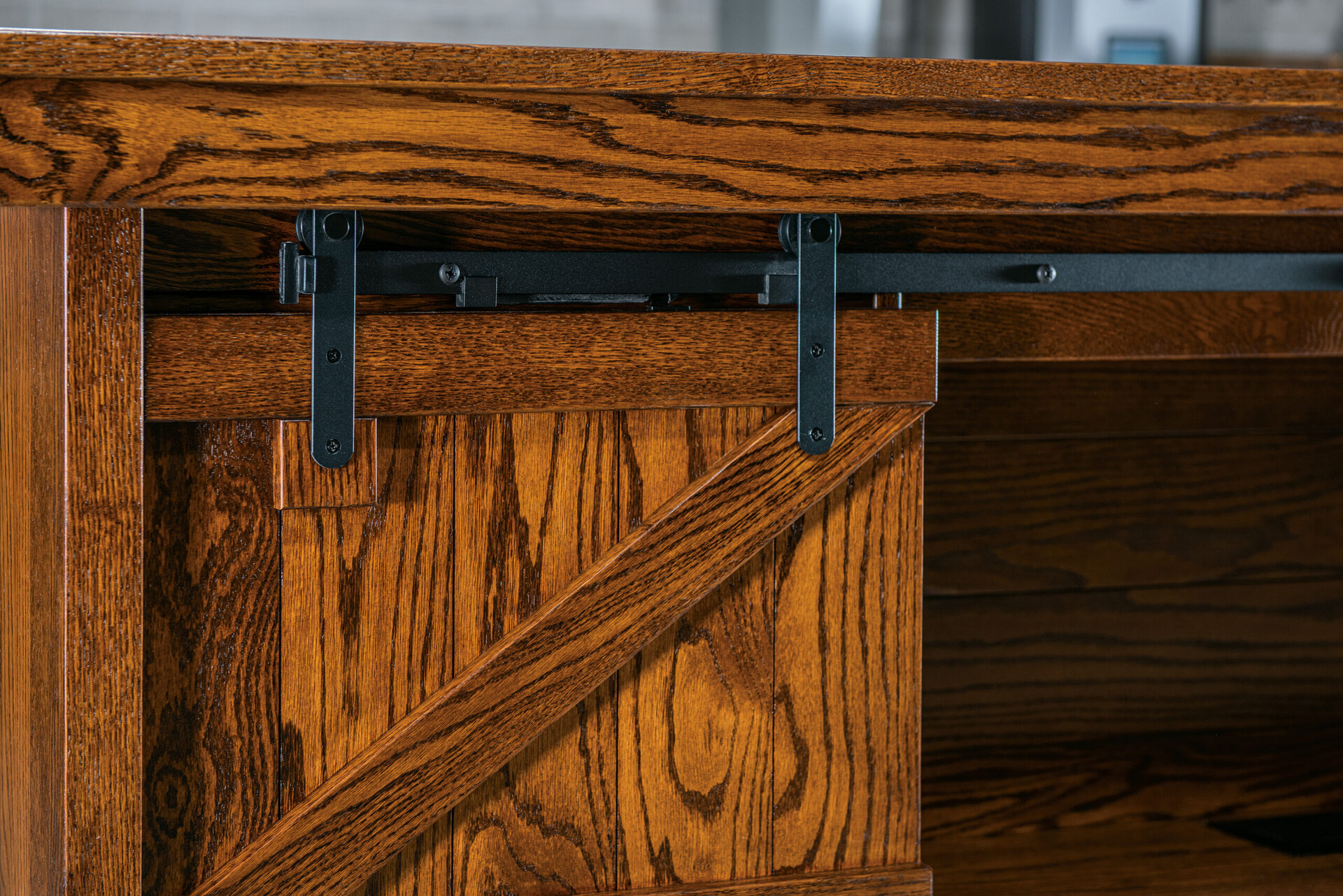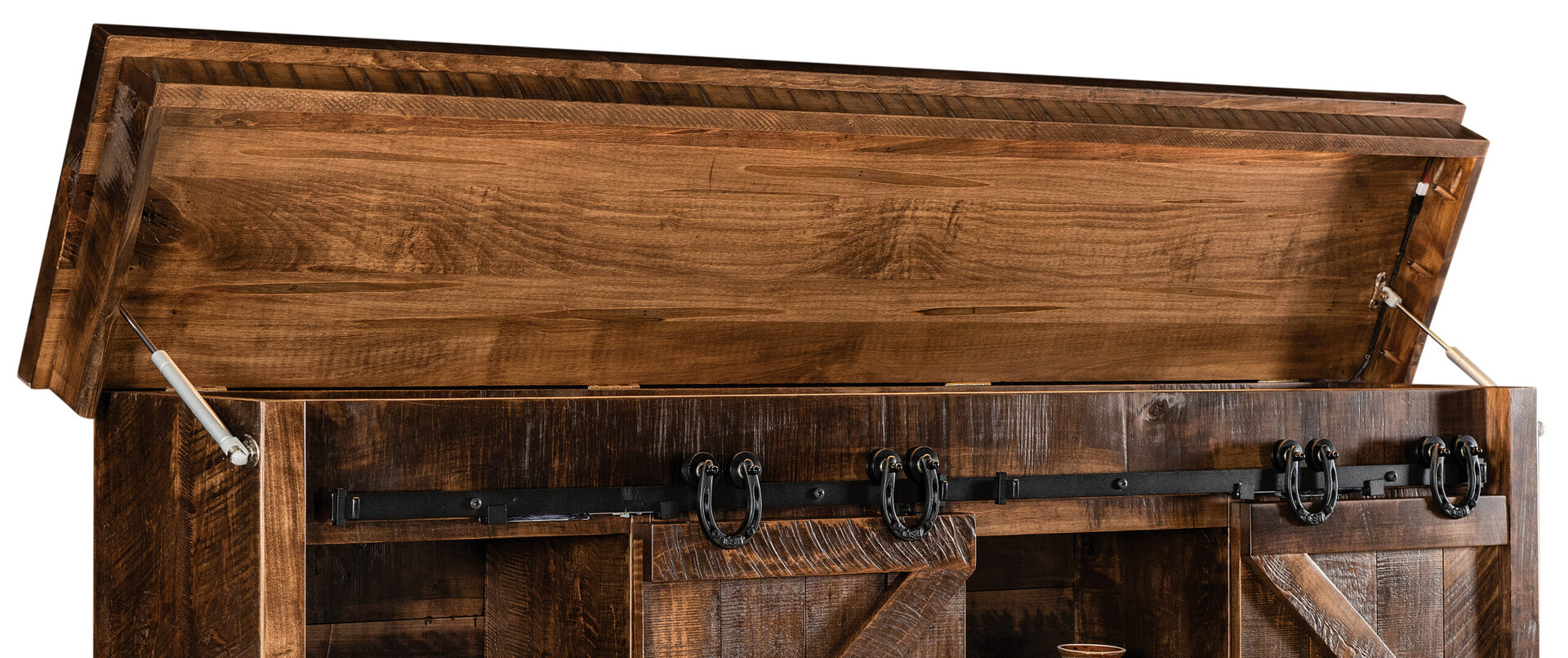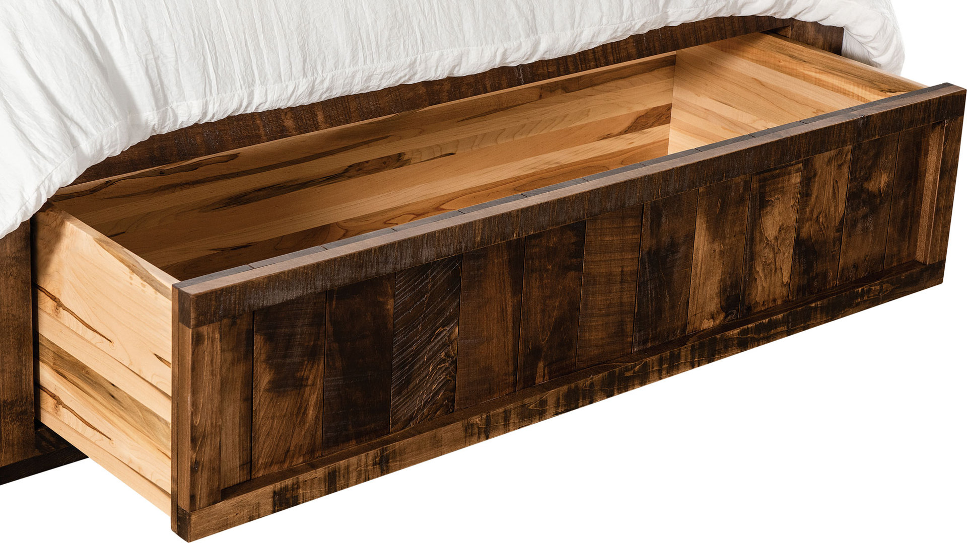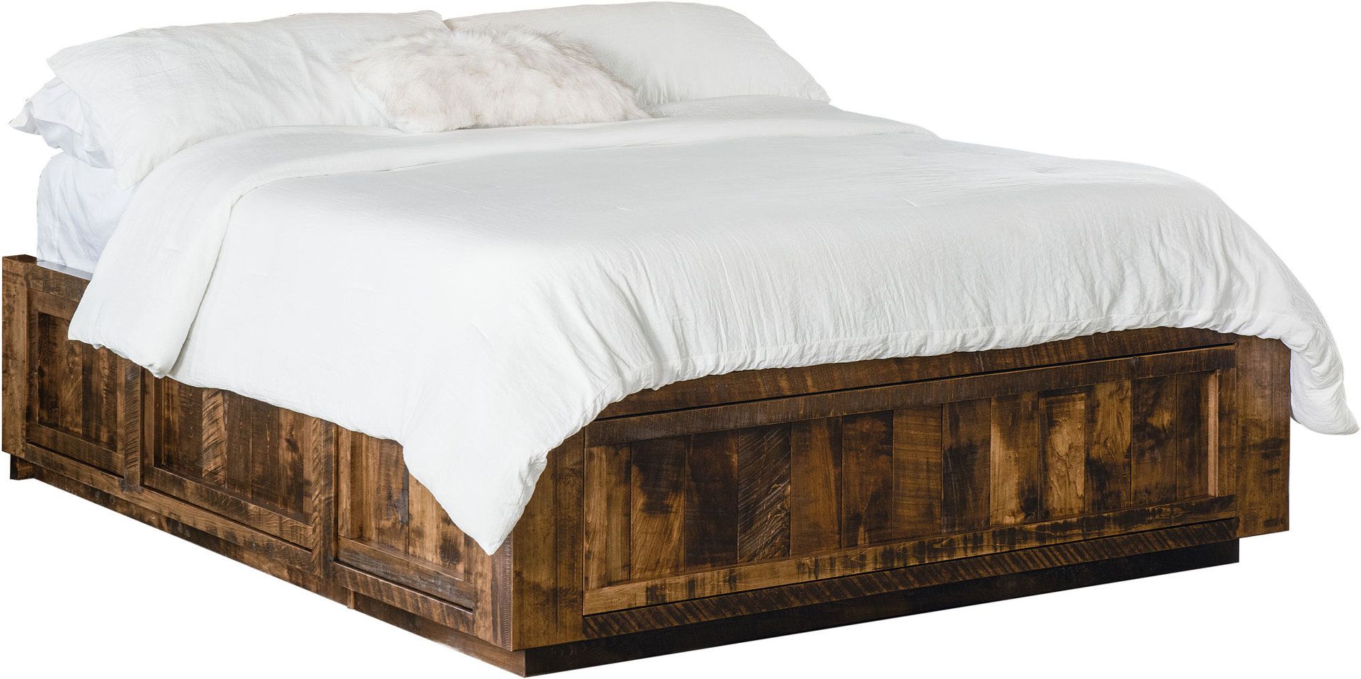 Reminiscent of traditional barns, the Rough Sawn Style Platform Bed comes with features not normally found in a bed. Notice the barn-style sliding doors that open up to reveal storage space. We also place storage drawers down below. This includes an optional treasure drawer. What’s amore, the drawers open full-extension. And they close with a gentle push. We offer the bed in king, queen (shown) and full sizes. So, you can order the size that best meets your needs and desires. Amish cabinetmakers — the best in the Midwest — build the bed. And they use top hardwoods like rustic rough-sawn brown maple (shown with Almond Stain #10 sheen). Ready to order? Click the “Customize this product” button below. Then, fill out the customizing fields. Or call 877-357-2106.