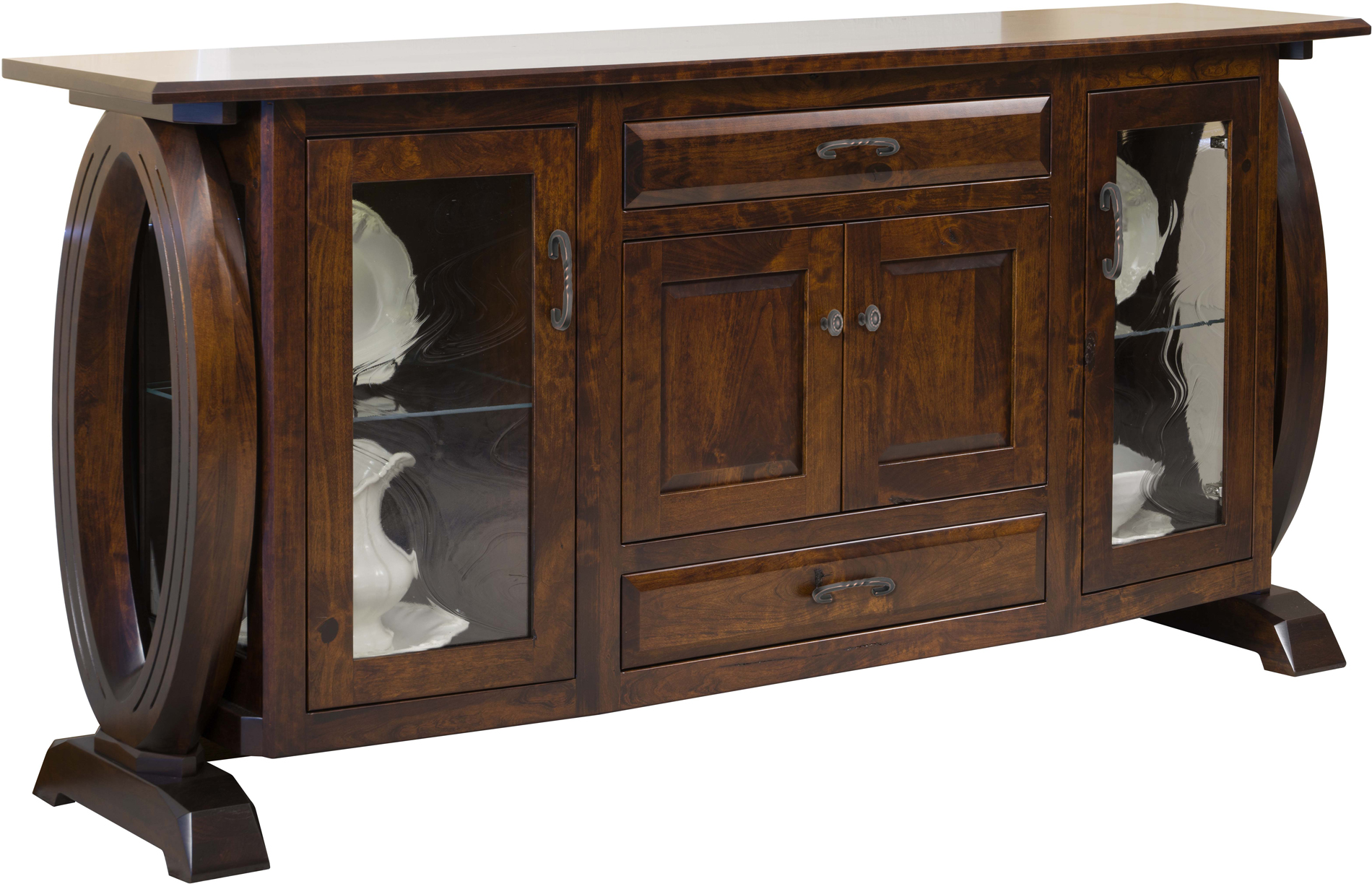 The Saratoga 4-Door Sideboard is like a premier-quality server and curio cabinet rolled into one. Notice that the central cupboard space is flanked by two curios — complete with Baroque glass doors and plain glass sides. The glass shelves and LED lights enhance the beauty of the piece. While the light guard prevents light from spilling around the doors. What’s more, the drawers open full-extension for easy access to all the items inside. And the drawers soft-close with a gentle push. Amish artisans — the best in the Midwest — build the sideboard from top hardwoods like brown maple (shown with Earthtone Stain). No wonder the piece is so sturdy, it’s heirloom-quality! Ready to order? Click the “Customize this product” button below. Then, fill out the customization fields. Or call 877-357-2106 today.