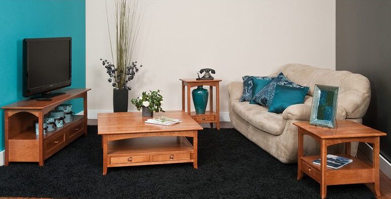 The Shaker Hill Open Living Room Set has a striking appearance and combines both classic style and function. The living room set is handcrafted with one inch thick top with reversed beveled edges and full inset drawers. Giving your space a finished look. The living room set has a great style. In addition, the collection features dovetailed maple drawers with premium soft close under-mount slides. In addition, each table features a solid wood shelf for additional storage to display your personal decor. The collection includes end table, sofa table, and a coffee table, coffee table with lift top, or square coffee table.