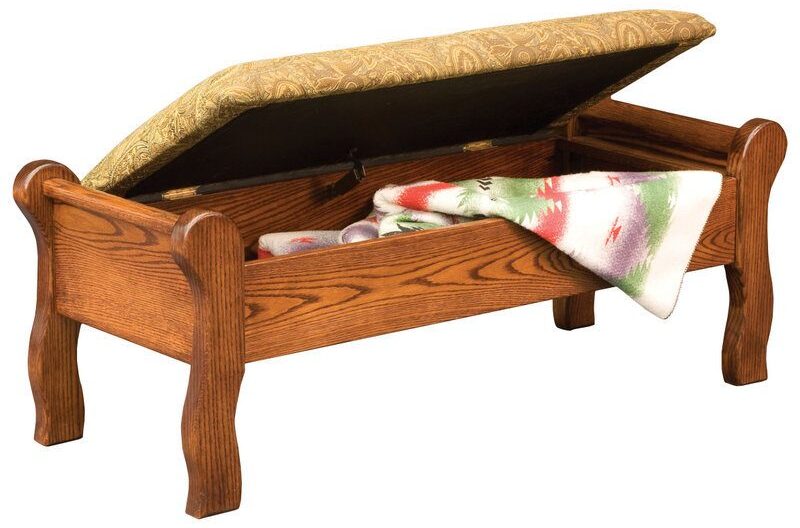 The Sleigh Bed Seat makes a great addition to your bedroom – such as the foot of your bed. Of course, it goes with other Sleigh pieces. Or, you can match it with numerous other furniture styles. You’ll love the plush seat. Plus the handy storage below the flip-up top. Amish cabinetmakers — the best in the Midwest — build the seat. And they use top hardwoods like cherry, maple and oak. No wonder the piece is so sturdy and heirloom-quality! Ready to order? Click the “Customize this product” button below. Then, fill out the customizing fields. Or call 877-357-2106.