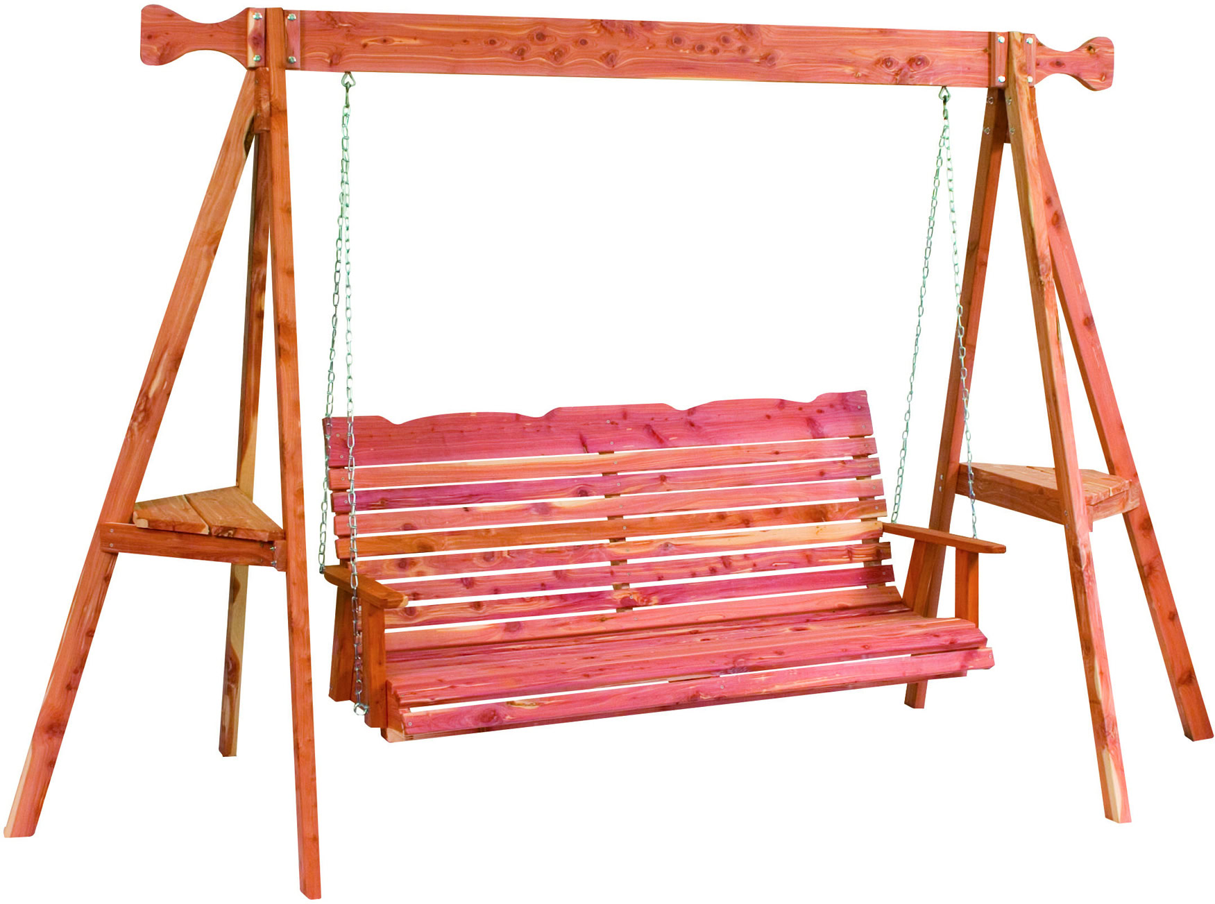 The Straight Back Tripod Swing provides the perfect space for sitting in comfort. Designed with shelves on both sides of the tripod, you will have room for your drink and phone will visiting family and friends on this comfortable straight back swing in your backyard. Constructed from red cedar, this sturdy swing is naturally resistant to pest and rot. With custom options available, you can create the perfect swing for your outdoor space.