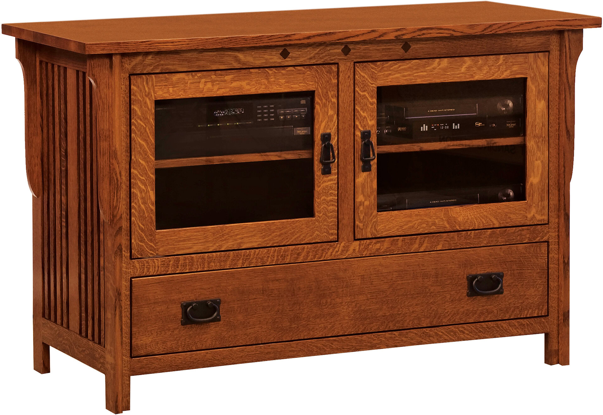 The beautiful Straight Royal Mission TV Stand has fine wood slats, decorative corbels and diamond shaped inlays. While it is petite, this stand boasts ample storage space and great utility. For instance, it has one adjustable shelf behind each glass door, a long, full-extension drawer and two soft-close doors. Thus, giving you the flexibility you need for all of your entertainment needs!