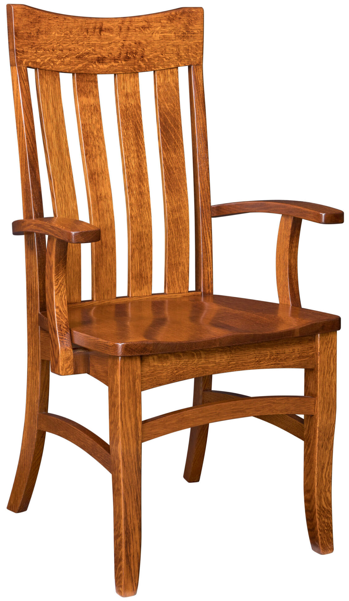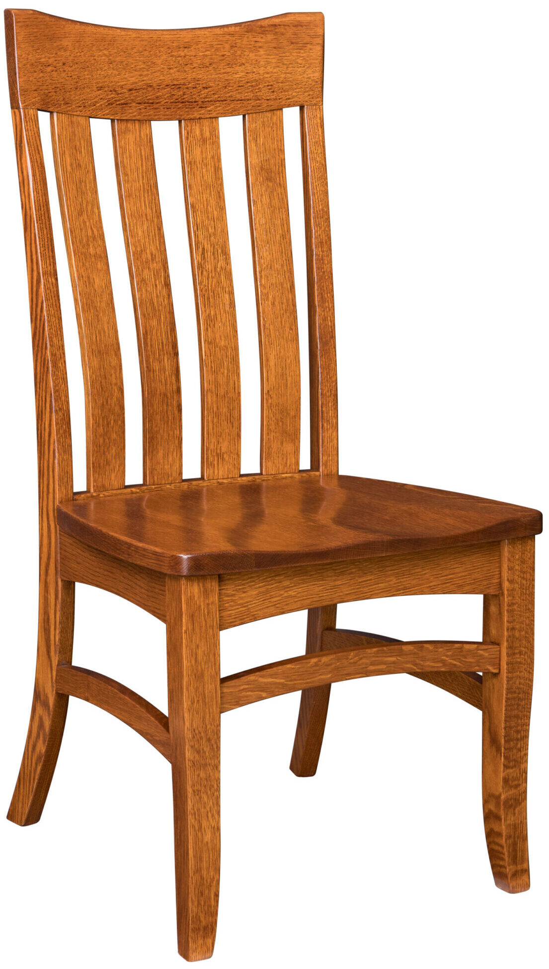 The Tampico Dining Chair makes an upscale impression with its curved slats, arched backrest and curved features in the base. What an elegant chair to complement your dining table! The curved slats help with lumbar support, and the saddle scoop seat enhances comfort. We offer the unit as a side chair and an armchair. So you can choose either one – or both. Also, the chair is available with an upholstered leather or fabric seat, or with a wood seat (shown). Amish cabinetmakers – the best in the Midwest — build the chair. And they use top hardwoods like maple, cherry and quarter-sawn white oak (shown with Michael’s Cherry stain). No wonder the chair is so sturdy and heirloom-quality! Ready to order? Click the “Customize this product” button below. Then, fill out the customization fields. Or call 877-357-2106.