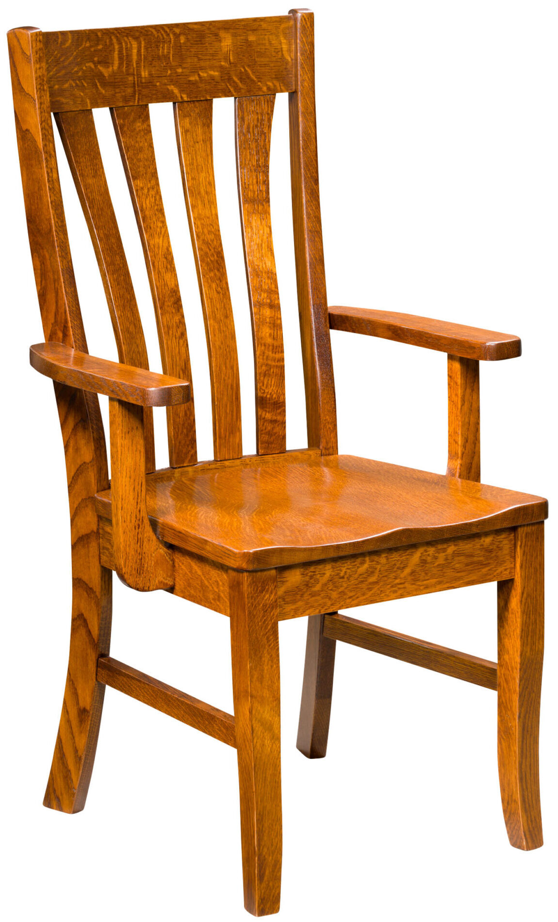With its tall backrest, curved slats and clean lines, the Vista Dining Chair makes a stately presentation. Imagine this handsome chair around your dining table! The steam-bent slats provide great back support. While the saddle scoop seat with Mission edge enhances comfort. Want even more comfort? Ask for an upholstered seat, finished in fabric or leather. Also, you can order your set of chairs in any combination of side chairs and armchairs. Amish cabinetmakers — the best in the Midwest — build the chair. And they use top hardwoods like quarter-sawn white oak (shown with Michael’s Cherry Stain). No wonder the chair is so sturdy, it’s heirloom-quality! Ready to order? Click the “Customize this product” button below. Then, fill out the customizing fields. Or call 877-357-2106.