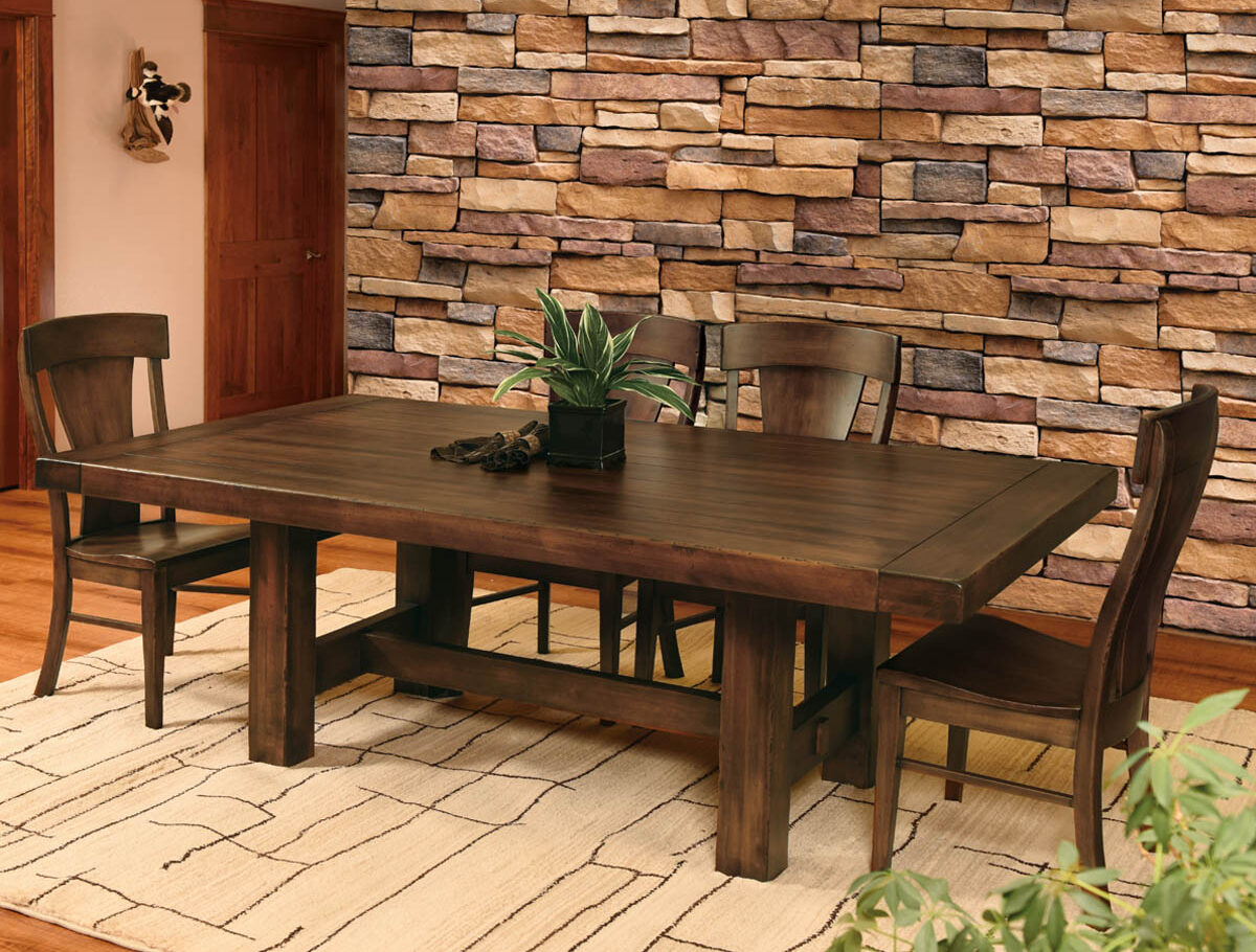 You will find the Wellington Trestle Dining Room Set checks all of the blocks for your home. The distressed finish, shown here, is a great look for a farmhouse-style home. Of course, you are welcome to select the finish that best suits your own personal style. The Ramsey Chairs boast sleek curved backs that complement the trestle table. These details all come together to create a cohesive set, perfect for any dining space. Finally, we also offer practical elements like the ability to expand the table with up to two leaves. So, you really can’t go wrong adding this collection to your home.
