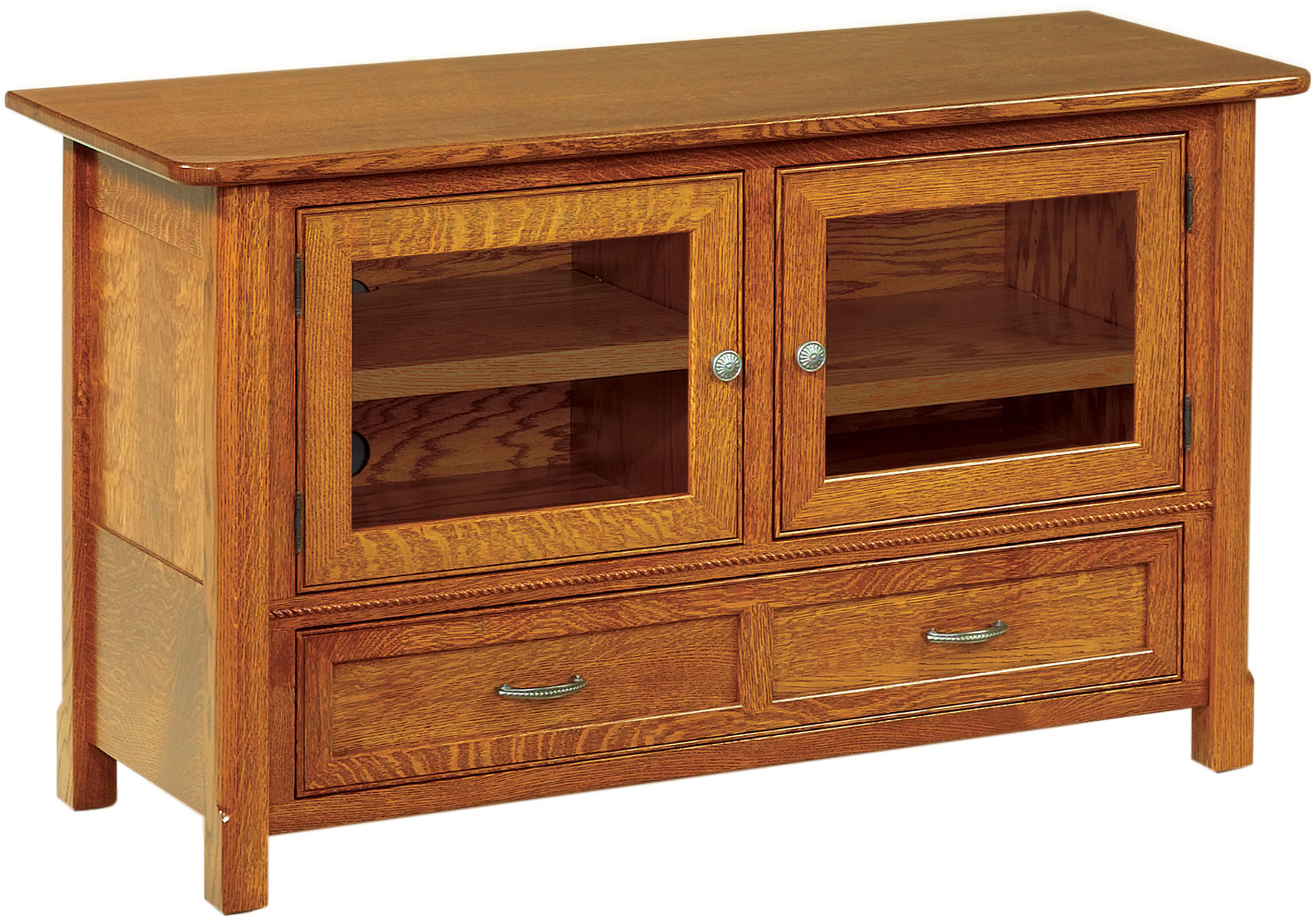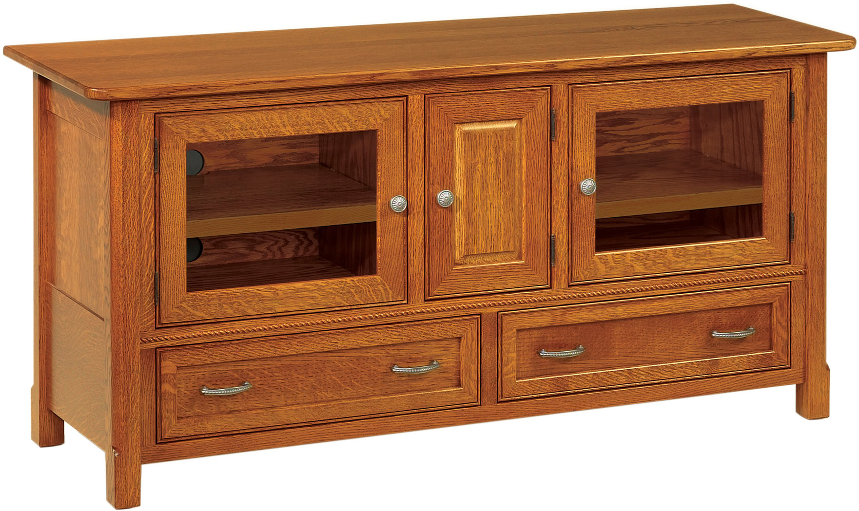 The West Lake TV Cabinets feature a sleek finish. Their straight edges give its traditional styling a modern twist. Unique accents like rope molding and mitered door and drawer fronts reveal the cabinet’s character. Between the size options, adjustable shelving, and full-extension drawers, you will have the perfect amount of storage for your person media collection. Finally, lightly smoked glass doors both conceal your devices and also allow your remote controls to function.