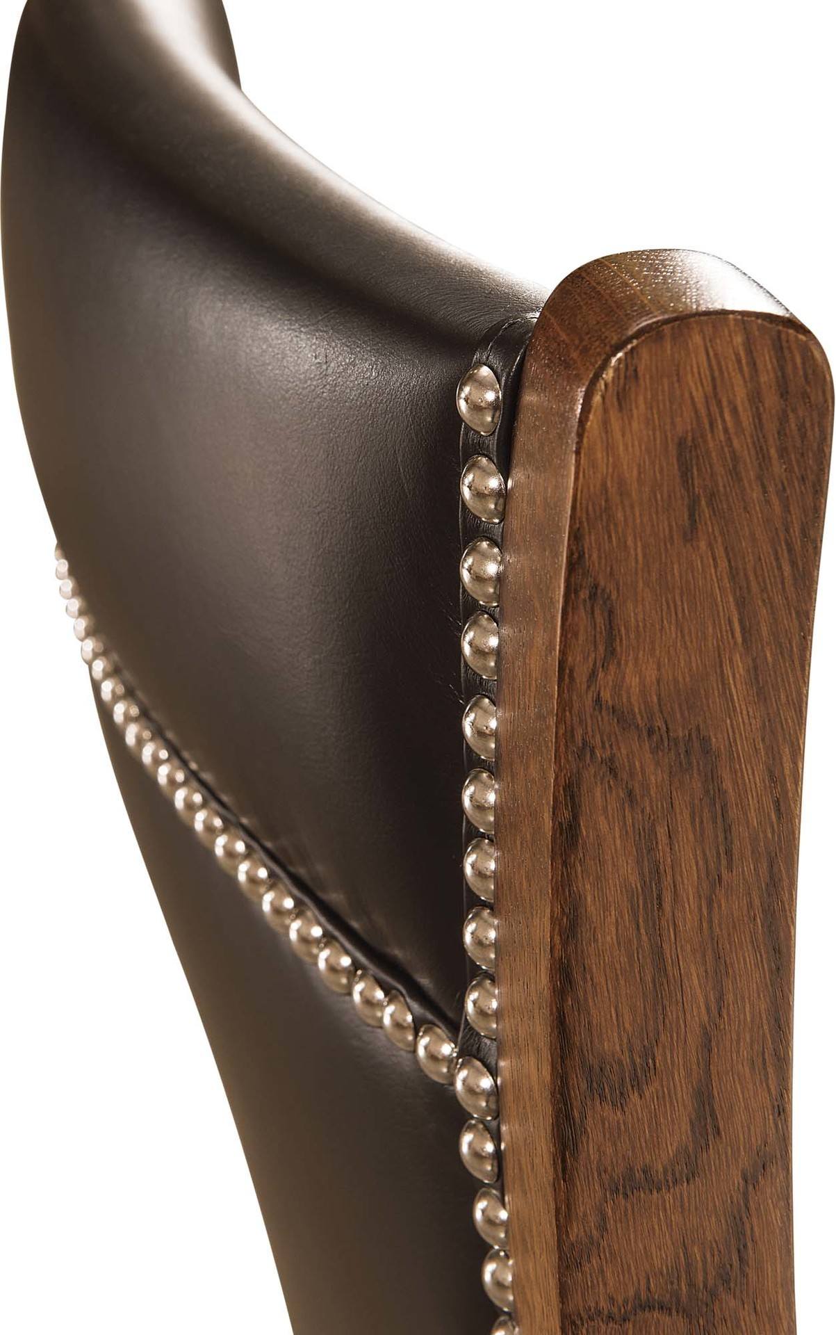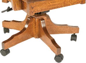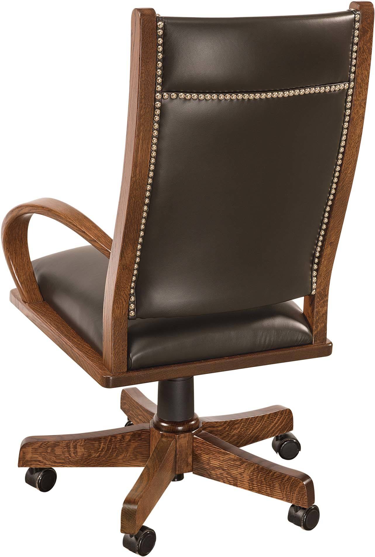 The desk chair is available as shown or unfinished. Or, we can custom-build it to your specs. Just tell us your choices for items like the wood specie and finish. Plus your choice of leather and fabric. The unit shown is quarter-sawn white oak with Asbury Stain and Black Leather with Nickel Tacks.